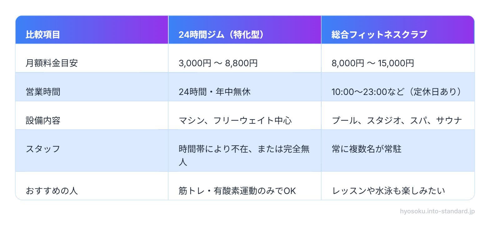 「総合フィットネスクラブ」と「24時間ジム」の主な違いを比較表にまとめました。